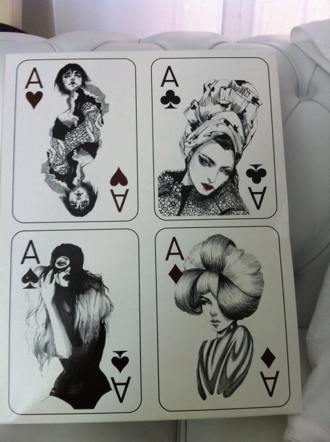 Nell’asso di picche, una donna misteriosa in body nero e capelli lunghi col volto ricoperto da una maschera quasi a ricordare catwoman e in quello di fiori una donna misteriosa e sofisticata con trucco marcato e turbante in stoffa, entrambi ricamati con paillettes sui toni del nero e blu; nell’asso di cuori viene raffigurata un’immagine riflessa allo specchio, misteriosa coi capelli corti che a me ricorda personalmente Alice di Twilight, mentre in quello di quadri (il mio preferito) una donna con acconciatura raccolta, molto elegante e sofisticata, entrambe ricamante con perle, pailettes e lustrini sui toni del viola e rosa.