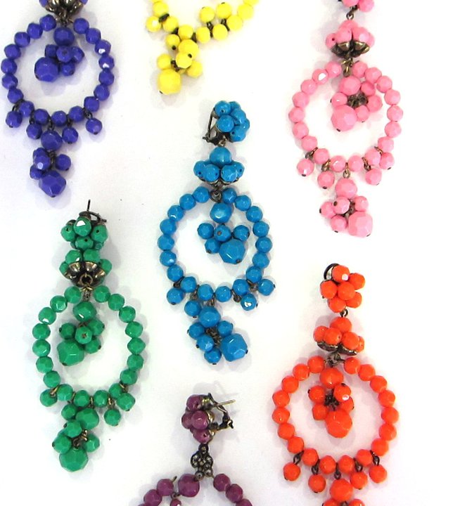 Si tratta di bellissimi chandelier,rigorosamente fatti a mano, composti da perline lisce o smerigliate,in vari colori: dal bianco al nero,passando per il giallo,fucsia,rosa ,verde,rosso,blu e quanto altro. Si presentano di varie forme: dal classico chandelier a più giri,alla goccia e i mazzi a cascata di fili di perline. Nel complesso, una grande varietà di forme e colori adatte a tutti i gusti!! La particolarità che amo di più di questi orecchini, e’ che sono in grado da soli di stravolgere un abito semplice e monocromatico,dandogli una nota frizzante,glamour e un tocco in più di vivacità e colore.