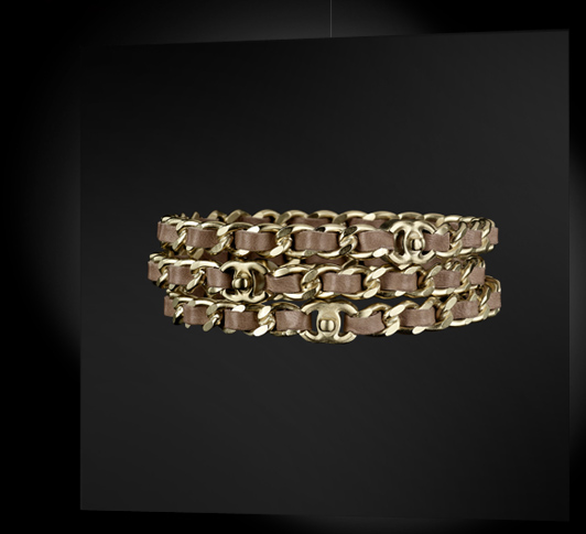 Set di magnifici braccialetti con catena di metallo e intarsi in pelle, riproducenti le catene delle borse Chanel classiche 2.55