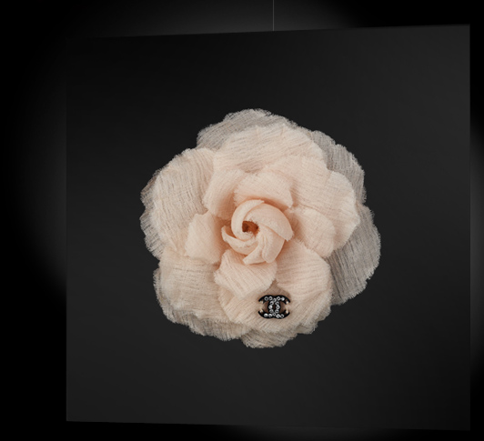 La spilla, sempre a forma di camelia in organza beige e panna con logo Chanel in metallo (uno dei miei pezzi preferiti della collezione)