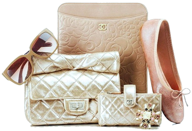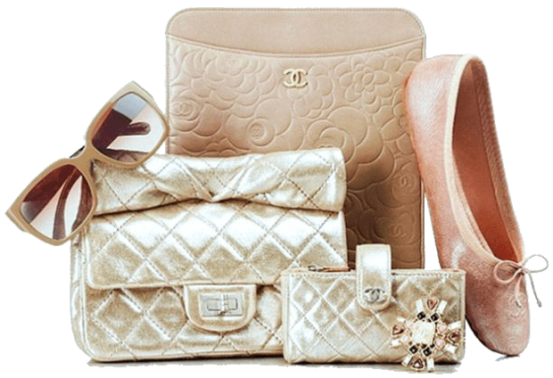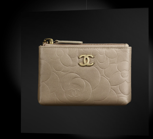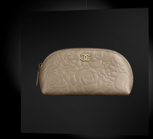 Per quanto riguarda gli accessori, possiamo scegliere tra una trousse in agnello goffrato, beige con le camelie ricamate e il logo Chanel nella parte superiore.