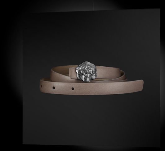La cintura in agnello marrone chiaro e fibia in metallo amovibile rifinita a forma di camelia con logo color argento