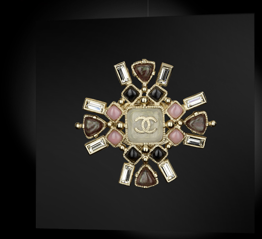 ..una meravigliosa spilla impreziosita con strass taglio “baguette” e cabochon in pasta di vetro.