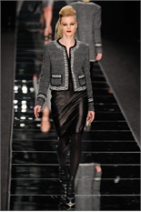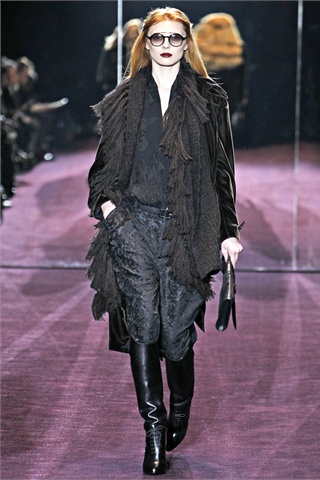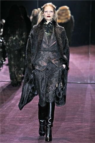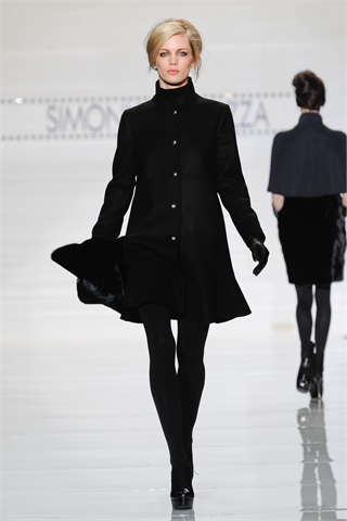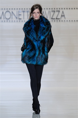 Ravizza ci proietta in una dimensione passata degli anni ’50: donne con capelli legati in alti chignon avanzano con un portamento altezzoso e sofisticato indossando pellicciotti corti nelle pelli più pregiate sulle tonalità dello scuro; colore predominante è il nero che viene ripreso anche nei colbacchi dello stesso pellame delle pellicce, che si ritrova anche nei cappotti.