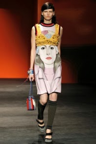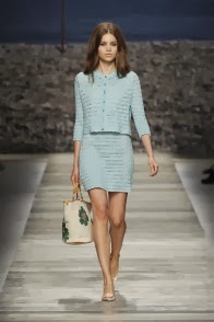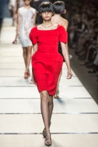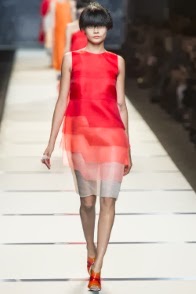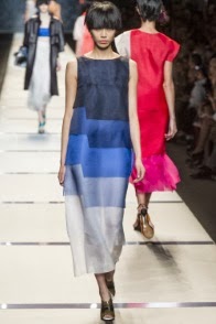 Segue la giornata Fendi, ancora una volta firmata dalla mano di Karl Lagerfeld. Lo stilista tedesco trasporta la maison, rimasta da sempre radicata al gusto italiano, a una dimensione nuova, surreale. La proiezione al futuro si manifesta nel degradè degli abiti a righe, che da scure, sfumano a toni più chiari sino ad arrivare al bianco ottico, e nelle acconciature delle modelle, che ricordano quasi caschetti di essere provenienti da una dimensione spaziale. Le forme sono ampie, morbide, che con il loro movimento seguono l’incalzare delle modelle creando nuvole colorate di estrema leggerezza. Leggerezza data dai tessuti in voile e schiffon.