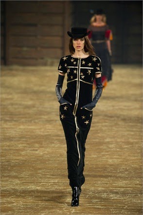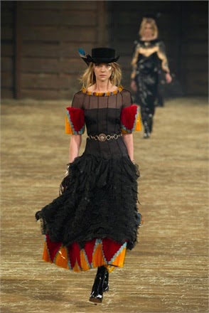 Perché si sa: da sempre lo stile country ha affiscinato le donne di tutto il mondo, ha dominato nello Street style di città e paesi. Ma per la prima volta questo stile diventa alta moda: i motivi geometrici indiani, le piume degli scaccia sogni diventano elementi di decoro e rifiniture di gonne e camicie. Le gonne si gonfiano ampie, a vita alta, composte da decine di strati di rouge sovrapposte le une alle altre. I bustier attillati, irrigiditi da stecche e impalcature, sulle maniche si aprono in ampi movimenti di piume e sete, le camicie goffrate con maniche composte da innumerevoli strati di voile e schiffon, i pantaloni attillati dove il jeans è il tessuto predominante. E non mancano nemmeno i cappelli: a tesa larghe nelle tradizionali varianti in jeans e vari pellami, e i classici camperos: gli stavali a punta in pelle perfetti per cavalcare i robusti cavalli americani.