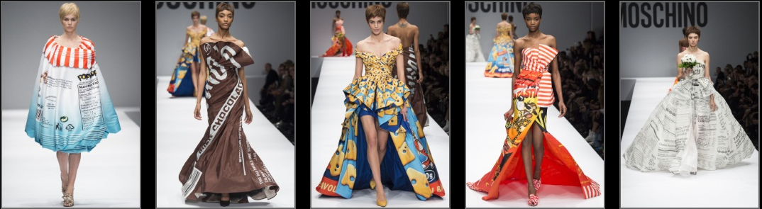 Il junk food, Spongebob e il quotidiano, nella sua valenza di carta straccia da spazzatura, diventano abiti, scarpe e borse da presentare sotto riflettori.