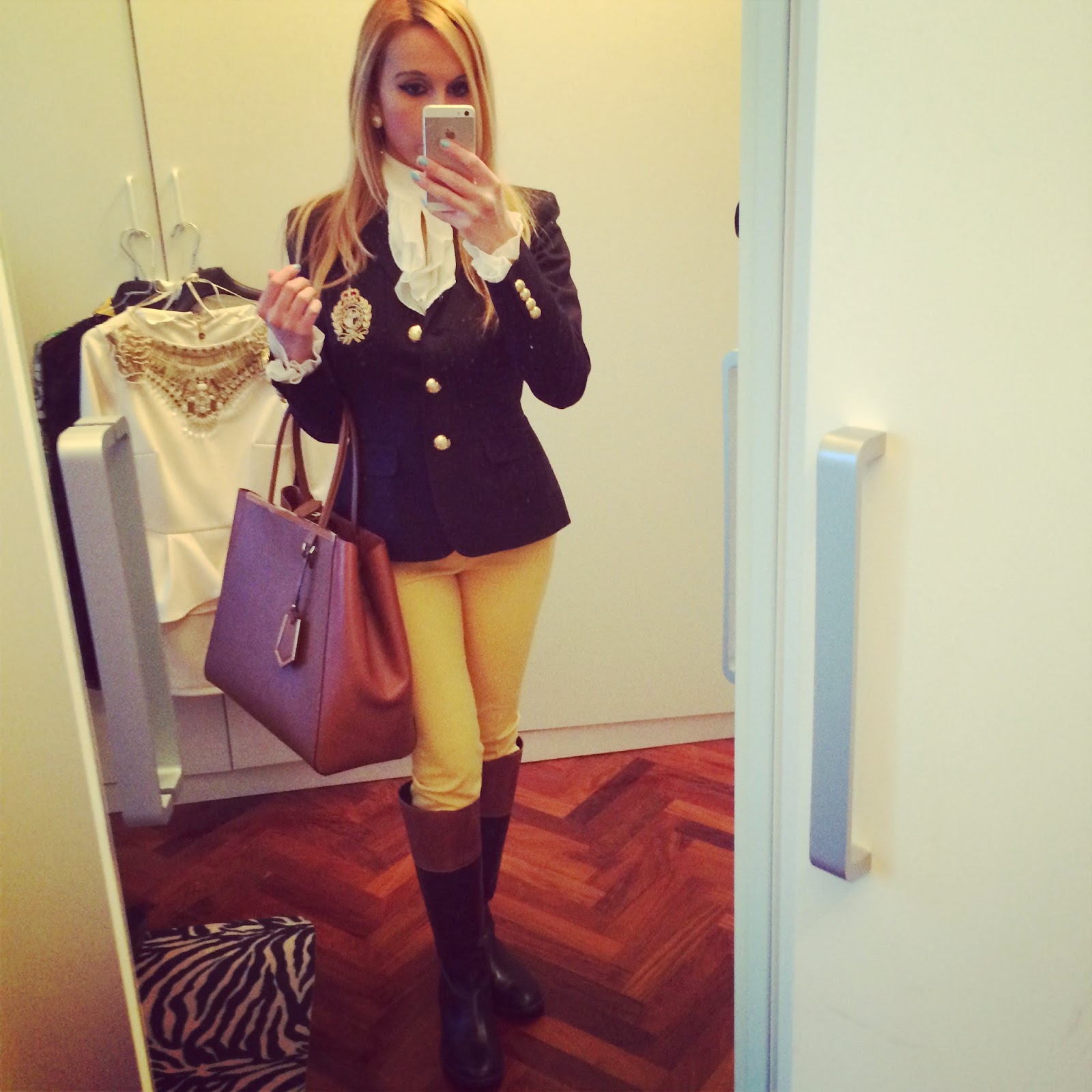 Trousers: Ralph Lauren; Boots: Gucci; Shirt: Dolce&Gabbana; Belt: Louis Vuitton; Jacket: Zara; Bag: Hermes Birkin Bag; Earings: Mercantia