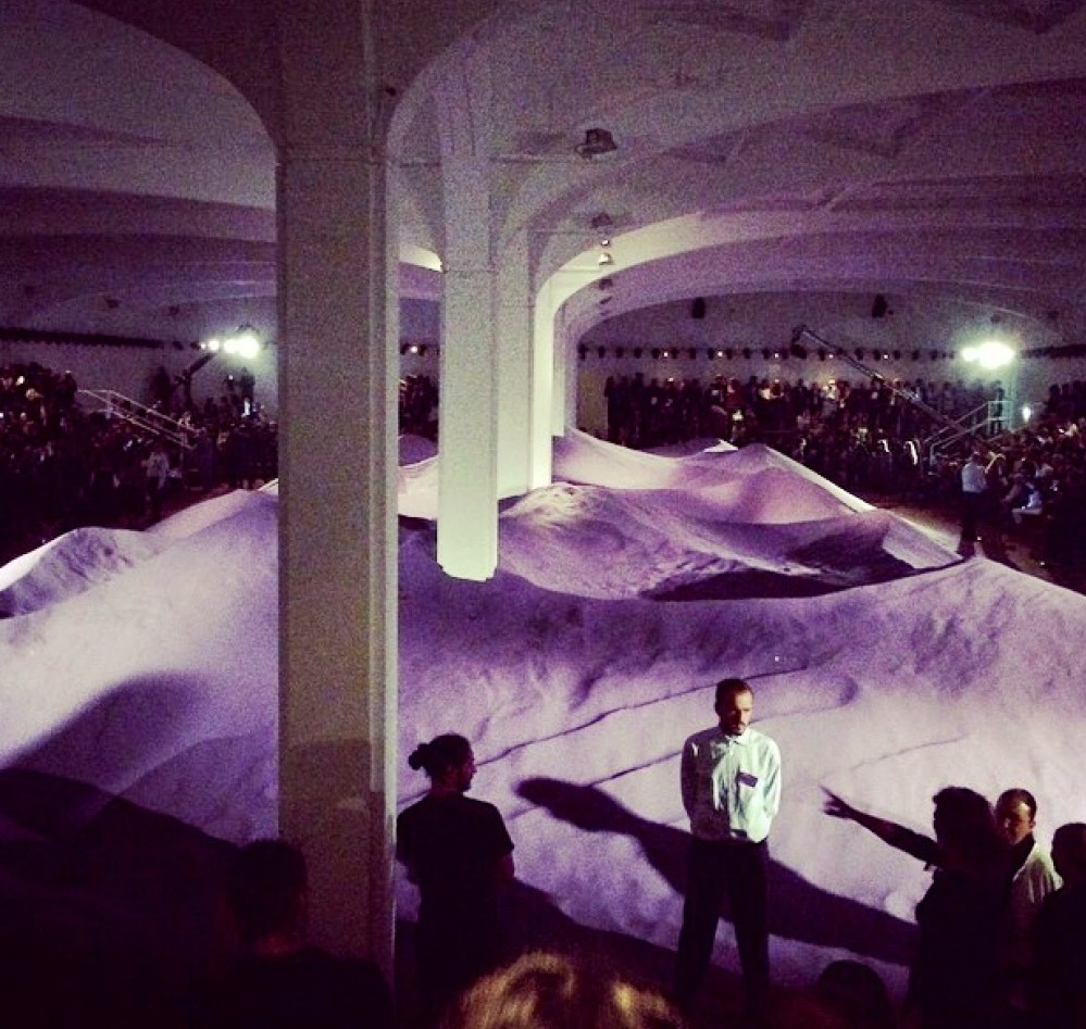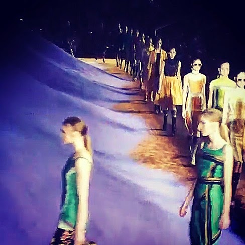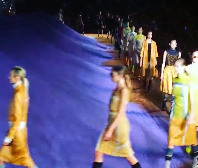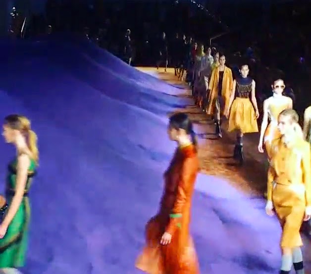 Una delle sfilate più attese per la sua versatilità e per la sua capacità di fare il bel e cattivo gioco è quella di Miuccia Prada. Stavolta la location che ci attende alla Fondazione Prada è del tutto onirica e metafisica. Quasi come se le stranezze di un sogno prendessero forma in questo grande spazio. Un porticato di alte colonne bianche regge una struttura sommersa da quintali di sabbia. Come archeologi di fronte alle rovine antiche di un palazzo nascosto, siamo portati alla scoperta di questo mondo e di questa collezione. Gli abiti che fuoriescono dalle macerie perfettamente incarnano questo mood: i tessuti sono poveri, antichi come il cotone, la garza e la seta grezza, e i colori quelli della terra e del mattone. Ma i modelli sono nuovi, attuali e la modernità viene emanata dai tagli architettonicamente studiati, dalle punture in bella vista, dagli orli sfrangiati. Moderno e antico convivono quindi assieme in queste modelle sculture, che come statue prendono movimento e vita al ritmo di una musica psichedelica.