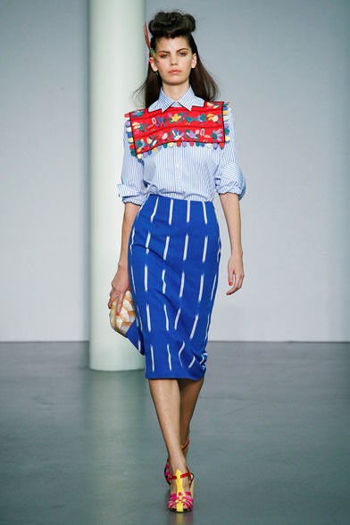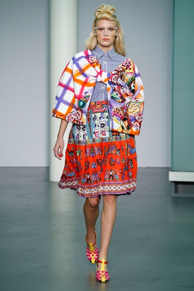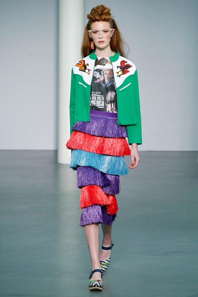 Un’esplosione di forme e colori invade la passerella di Stella Jean. Le sue origini haitiane emergono dalle stampe a tema folkloristico di abiti, camicie e coat. La palette è vivace, accesa e riprende i colori della propria terra come il giallo, il rosso, l’azzurro e il verde. Le forme sono quelle delle feste tradizionali dei paesi del Centro America caratterizzate da balze consecutive in gonne e polsi delle camicie che, abbinati con sandali e ciabatte flat, creano perfetti movimenti danzanti all’incalzare delle modelle. Il tutto si consuma in un perfetto mix and match che non disturba lo spettatore ma anzi, lo immerge perfettamente nella festa creola rappresentata.