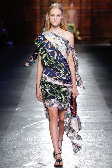 Ventata di freschezza e di novità in casa Emilio Pucci. Lo storico stilista di MSGM, Massimo Giorgetti, porta lo stile pop alla maison fiorentina senza mai dimenticare i tratti e le fantasie che l’hanno resa celebre in tutto il mondo. Con Giorgetti vediamo gli storici foulard sfrangiarsi e accostarsi tra di loro in giochi di mix and match, creando forti contrasti tra stile pop e romanticismo. Gli eleganti abiti da sera ricamati di pizzo e paillettes sono adagiati sopra sporty sweather, i ritagli di differenti tessuti e fantasie vengono cuciti insieme e rivisitati in forme classiche come il monospalla, mentre la stampa tipica della maison si svuota in giochi di trasparenze dal forte potere seduttivo. Non mancano nemmeno le ampie t-shirt logate, molto amate dallo stilista, i pantaloni dal taglio maschile e i disegni stilizzati a tema marittimo, leitmotiv molto ricorrente in tutte le collezioni di questa Milan Fashion Week.