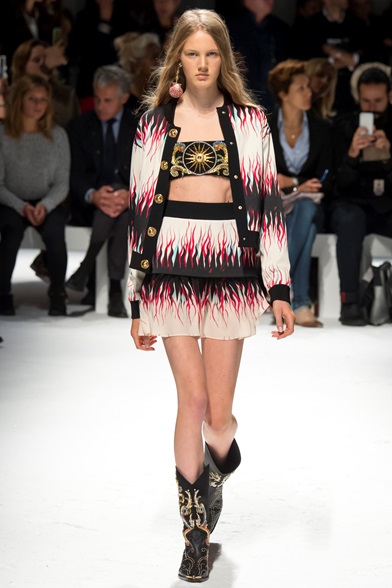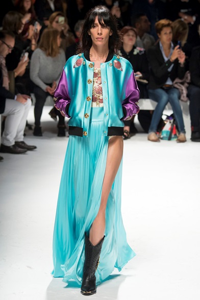 Divinità marine ricoperte di pregiate conchiglie, sirene dalle lunghe code fluttuanti, guerriere hard rock di Poseidone: sono queste le muse ispiratrici di Fausto Puglisi. Come una moderna rappresentazione dell’Odissea di Omero, lo stilista siciliano porta la forza del mare in passerella, mescolando antichità e moderno, romanticismo e aggressività. Le pregiate conchiglie del Mediterraneo ricoprono micro gonne in pelle nera e top crop, accompagnati da stivali texani di ispirazione americana; lo chiffon plissettato si plasma in romantici abiti a tunica greca, fluttuanti nell’aria come onde dell’oceano, ma sempre modernizzati dai forti accostamenti di giubbetti a chiodo e biker in pelle. Ed è proprio lo spirito rock a dominare nella seconda parte della sfilata: giacche, gonne e tute ricoperte di rosse fiamme creano forti giochi di aggressiva seduzione, per poi lasciare il posto sul finale alla lucentezza del raso e della seta, riportandoci nella dimensione antica delle divinità greche del mare.