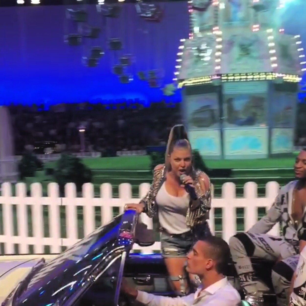 A completare il tutto arrivano loro, le due donne protagoniste della serata: prima Paris Hilton, che dal candore di ragazza Barbie tira fuori il suo lato aggressivo indossando un lungo abito nero dai seducenti tagli sul bustier e sfilando come una modella, e poi Fierge, iconica star dei Black Eyed Peas, che irrompendo sulla scena in una cabriolet vintage, regala agli spettatori un mini-concerto dal sapore rap.