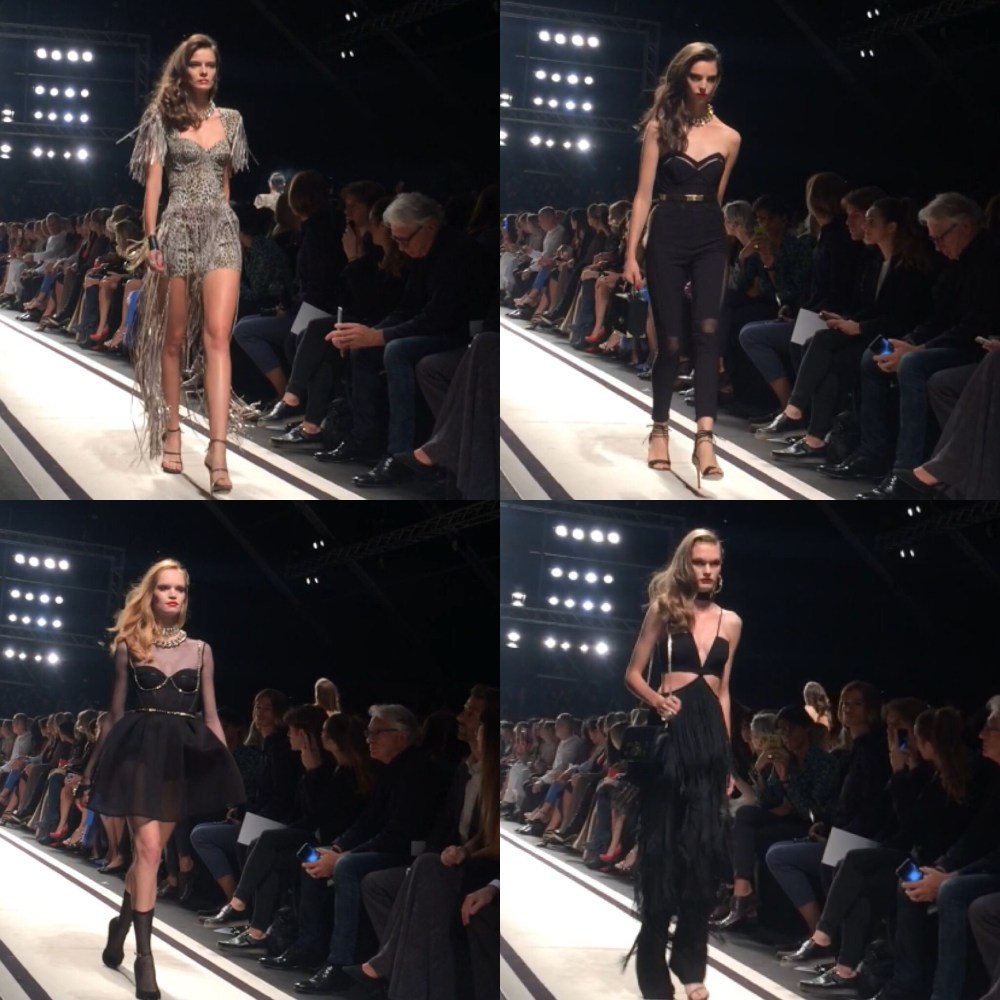 L’eleganza del nero risplende sotto importanti cinture e accessori in Swarovski, focalizzando la scena su una donna seducente e pienamente sicura di se stessa. Consapevolezza che viene enfatizzata dall’immancabile animalier il quale, abbinato al metallizzato in pantaloni alla caviglia a vita alta e bluse dalle ampie scollature, esalta l’irriverenza del corpo femminile. Personificazione di ciò diventa l’entrata in scena di Anna Cleveland, la quale effettua la sua passerellla fumando il sigaro.