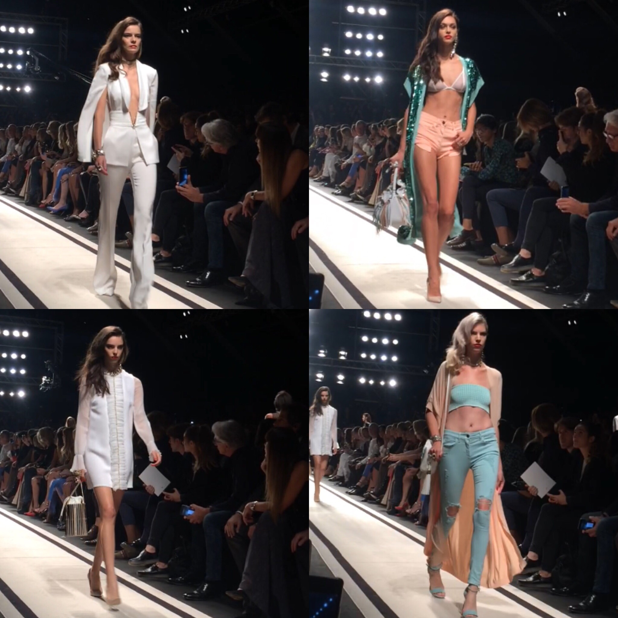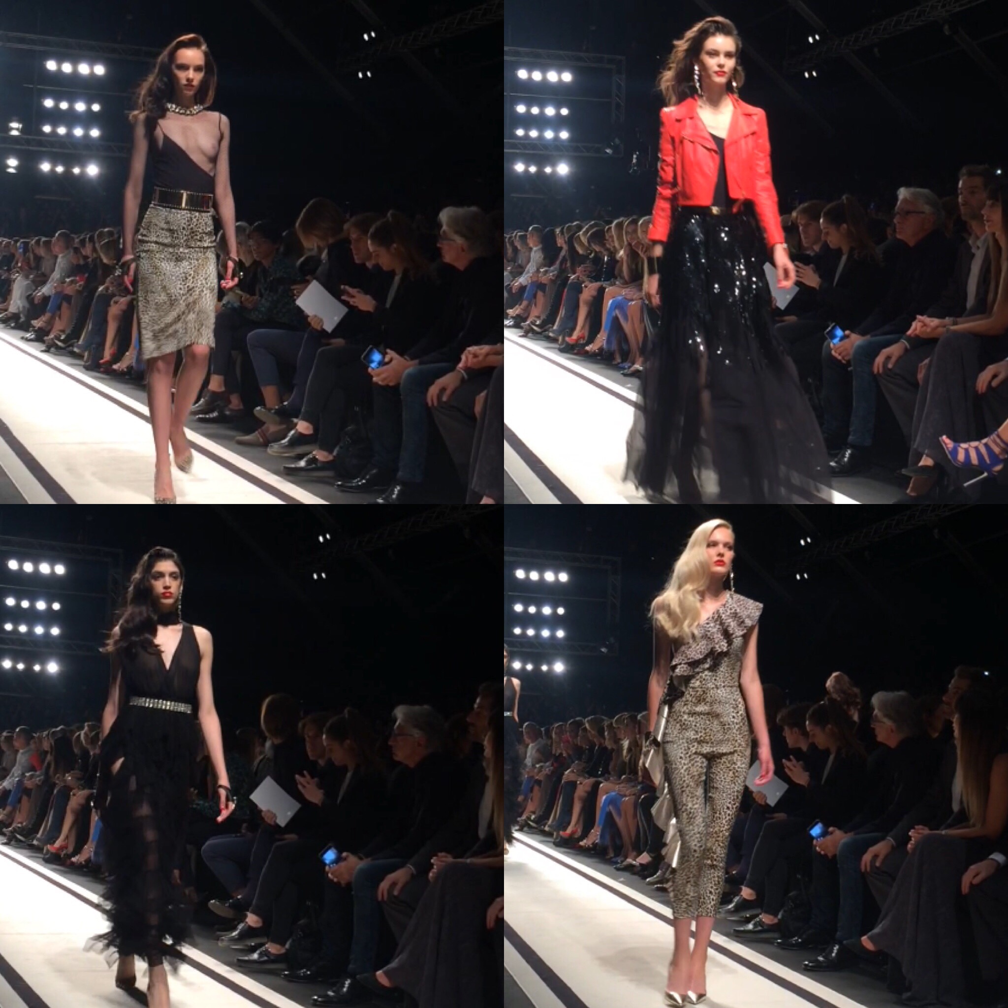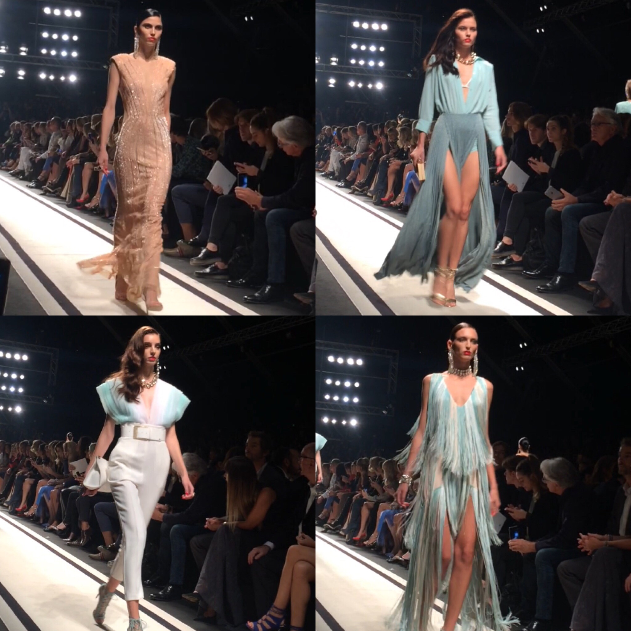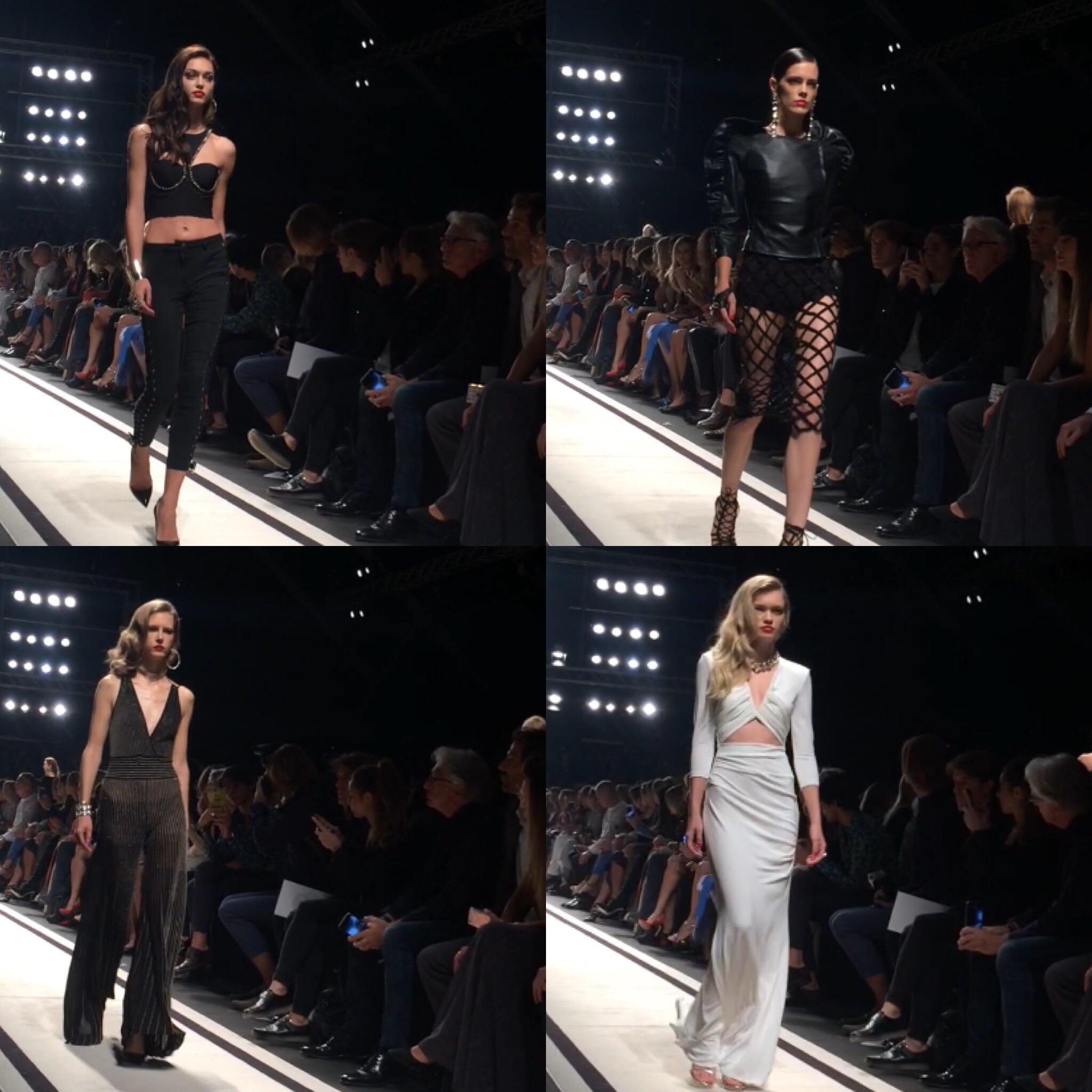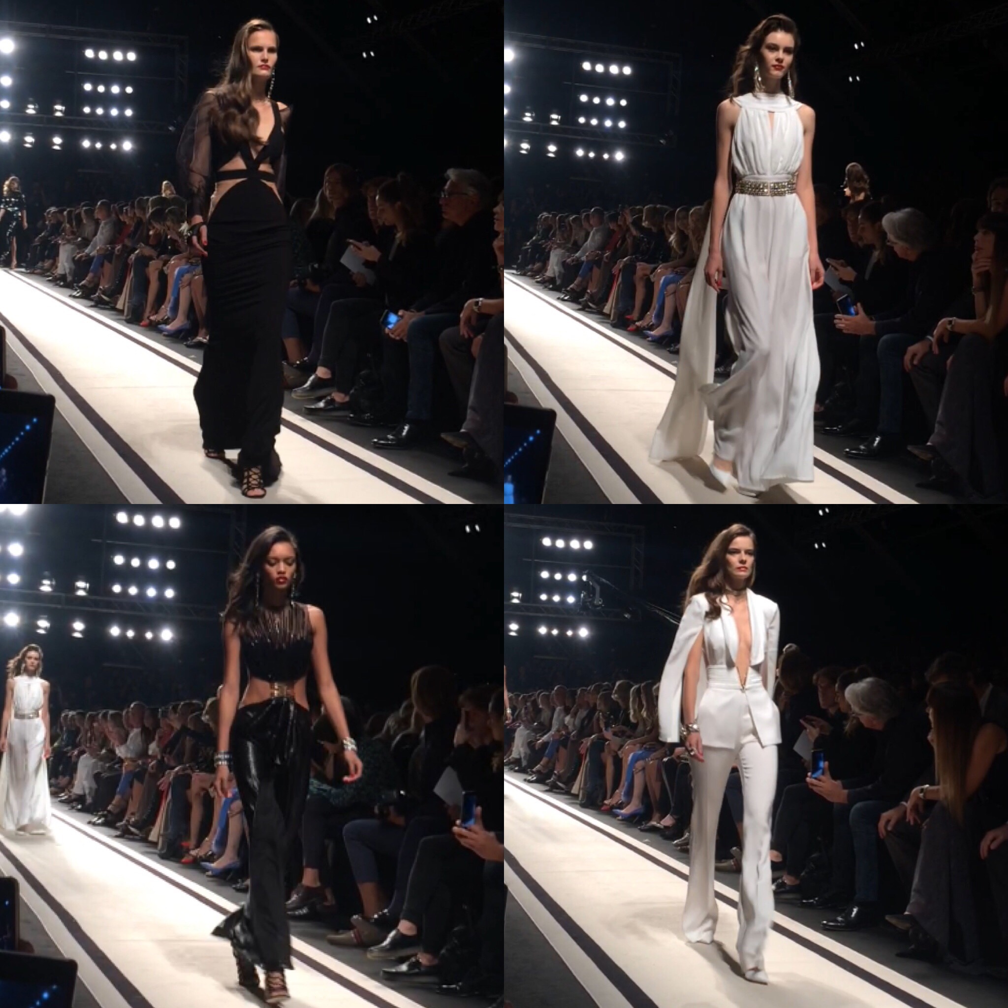 L’erotismo patinato della donna rappresentata da Helmut Newton prende materia in questa collezione primavera – estate 2017 di Elisabetta Franchi. Longilinea, sofisticata e altezzosa, nel suo chignon impreziosito da importanti chandelier, la donna della stilista bolognese incalza la passerella vestita in capi dalle profonde scollature e lunghe gonne attillate.