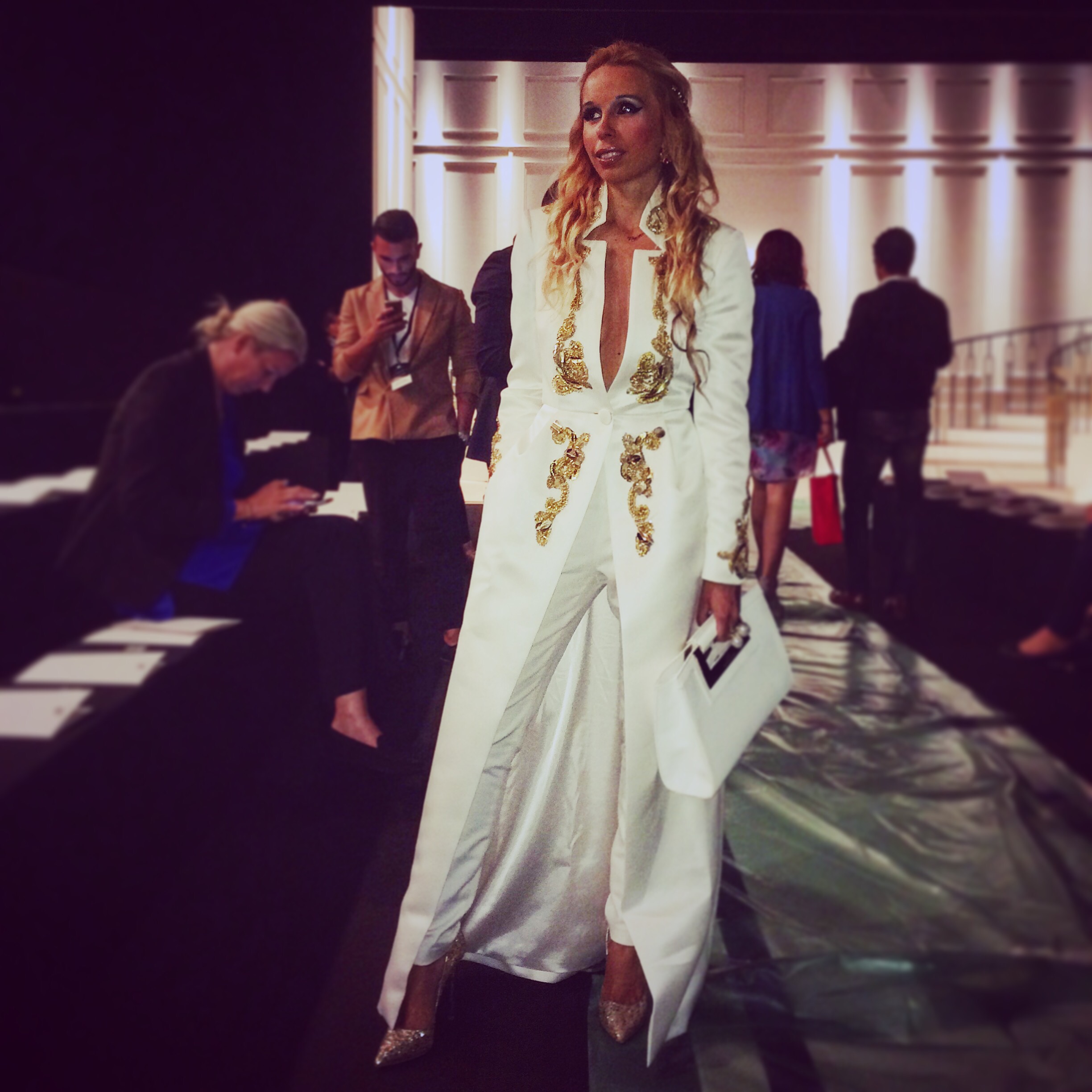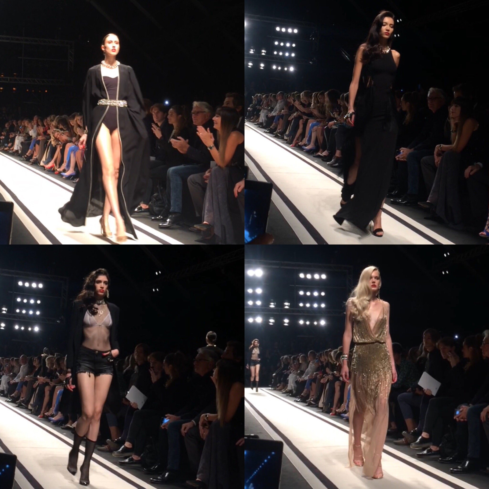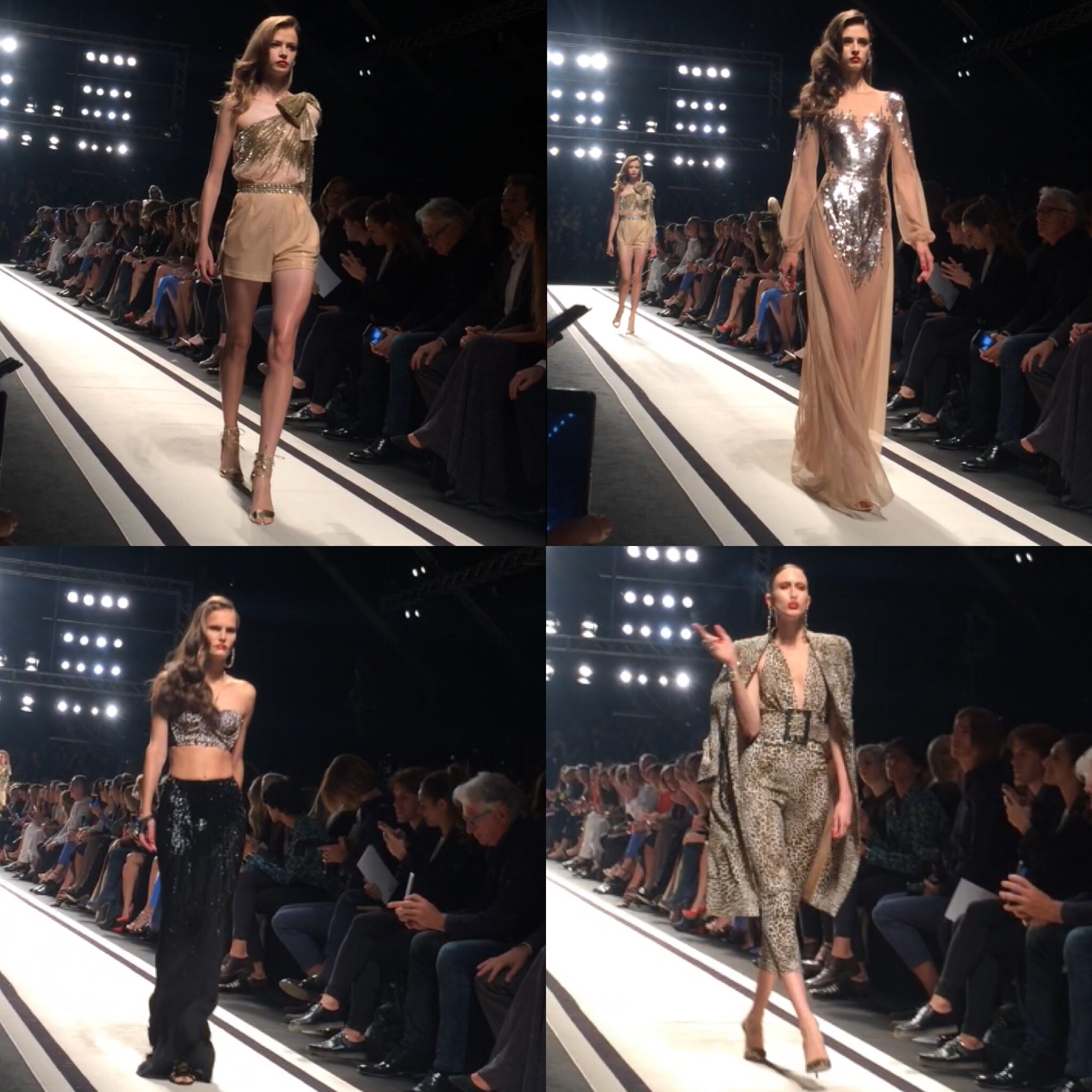 L’eleganza del nero risplende sotto importanti cinture e accessori in Swarovski, focalizzando la scena su una donna seducente e pienamente sicura di se stessa. Consapevolezza che viene enfatizzata dall’immancabile animalier il quale, abbinato al metallizzato in pantaloni alla caviglia a vita alta e bluse dalle ampie scollature, esalta l’irriverenza del corpo femminile. Personificazione di ciò diventa l’entrata in scena di Anna Cleveland, la quale effettua la sua passerellla fumando il sigaro.